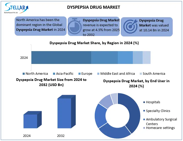 ORLANDO, FL, UNITED STATES, October 1, 2025 /EINPresswire.com/ -- Dyspepsia Drug Market valued at USD 10.14 Bn in 2024 is projected to reach USD 14.42 Bn by 2032, growing at 4.5% CAGR, driven by functional and organic dyspepsia, PPIs, antacids, and rising patient awareness globally.— Navneet Kaur